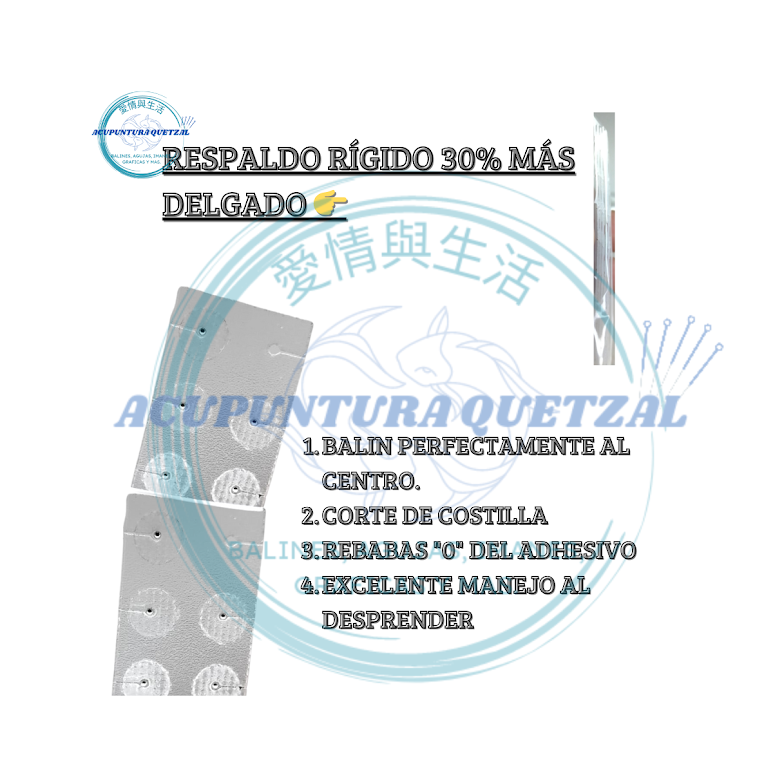 Cada balín está montado sobre un respaldo rígido con corte lateral, proporcionando facilidad en la aplicación y mejor maniobrabilidad para los profesionales. Este diseño único asegura que la técnica aplicada sea más precisa y eficiente.